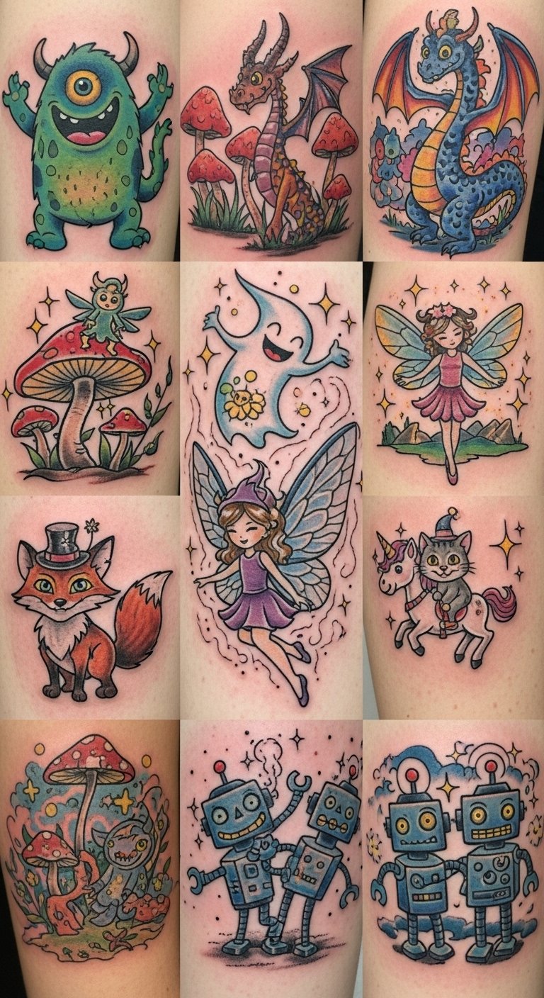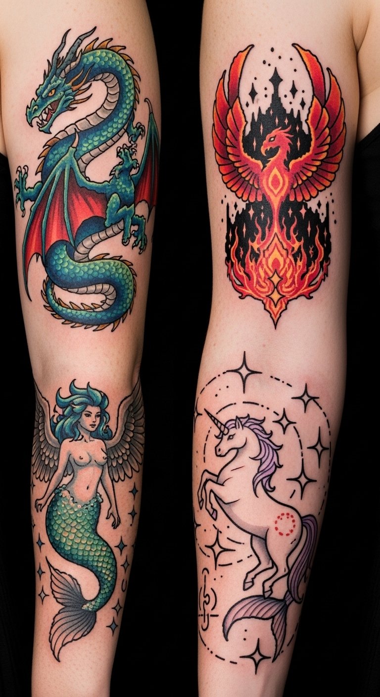 This tattoo concept blends nostalgic pixel-art edges with flowing mythic forms to evoke wonder and empowerment; dragons wrapping the forearm symbolize strength and protection, a small unicorn on the wrist adds innocence and hope, and a phoenix placed on the upper back signifies rebirth.