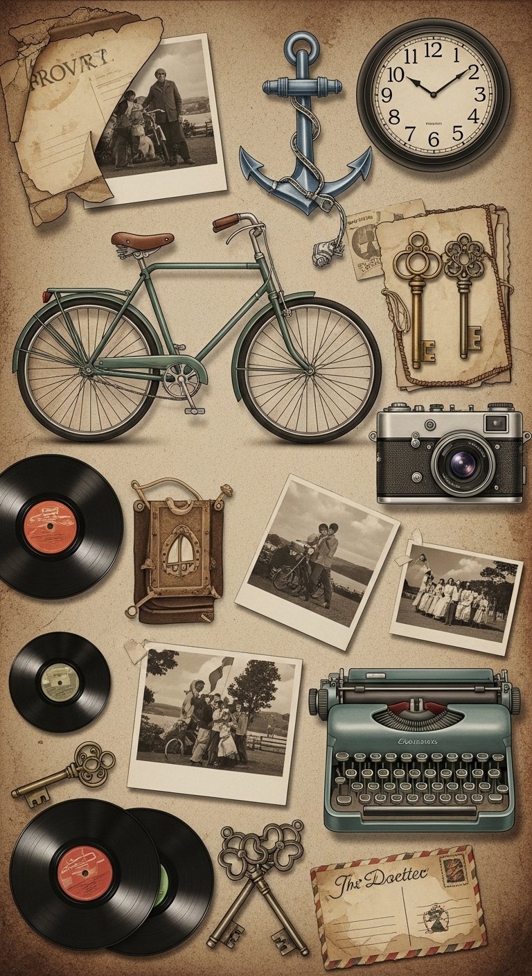 A compact forearm or upper back piece combining a retro camera with a sepia-toned faded photograph tucked into an antique postcard, an old school typewriter key and a small vintage bicycle silhouette entwined by a delicate ribbon bearing a tiny vinyl record; this composition symbolizes memory, journey, and creative expression—evoking warmth, nostalgia, and the bittersweet passage of time—and works well on the inner forearm, shoulder blade, or chest where it can be personal, visible when desired, and age gracefully with the skin.