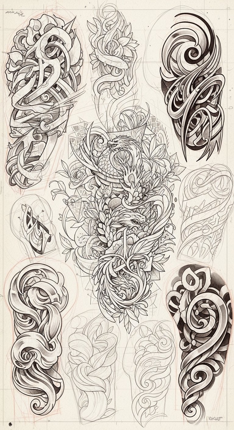 This concept envisions a multilayered tattoo where translucent sketches overlap: delicate linework silhouettes, gestural charcoal textures, and subtle watercolor washes merging into a cohesive composition. Symbolically, the layers represent the facets of personal narrative—memories, emotions, and growth—intertwining to form a singular identity; emotionally the piece evokes introspection and liberation through its open, flowing shapes. Recommended placement is the upper arm or ribcage to allow for vertical layering and expansion, with finer detail on smoother skin areas and bolder strokes wrapping naturally with muscle contours.