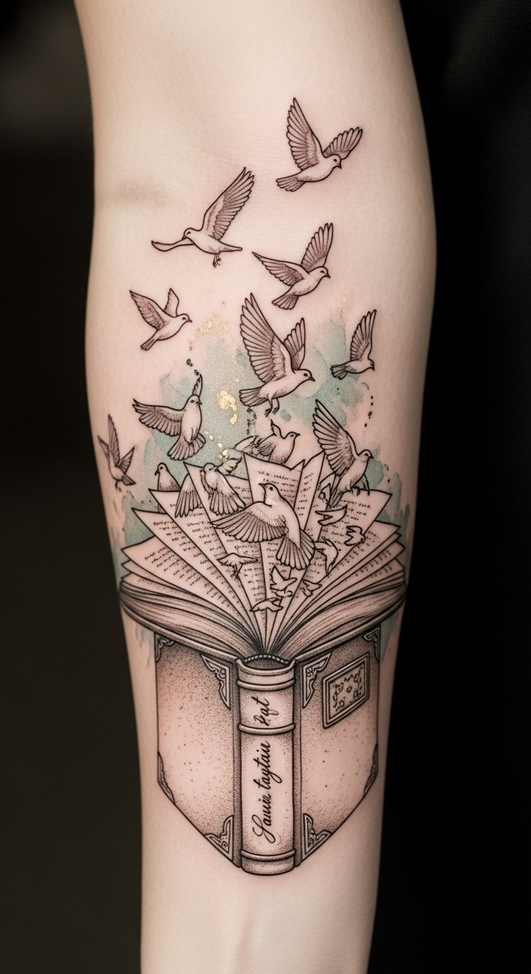 This design merges the physical and the transcendent: the open vintage book represents the foundation of your story and personal history, the pages transforming into birds symbolize ideas taking flight and the freedom of imagination, and the faint quote along the spine anchors the piece with a specific emotional touch.