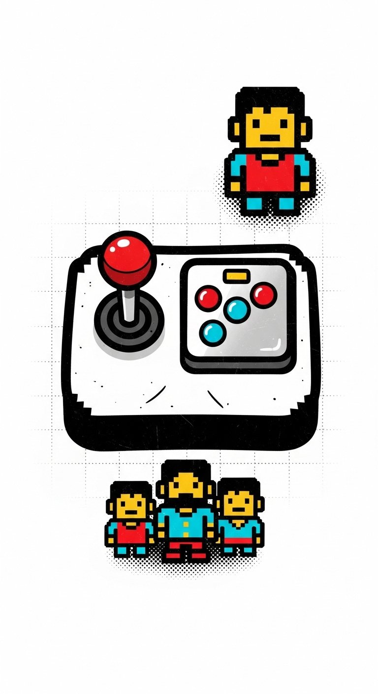 A compact chest or forearm piece symbolizing personal heroism, playfulness, and the rooted memory of early gaming: the joystick represents control and agency, the pixel trio evokes companionship through shared adventures, and the limited palette highlights the simplicity and warmth of nostalgia;