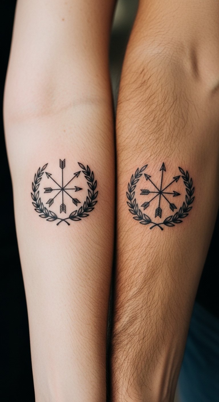 A minimalist matching tattoo concept: two complementary shapes—a half-woven bracelet knot and a small, stylized compass—rendered in fine black linework with subtle dot shading and a single shared accent color (teal or gold) connecting both pieces; one friend wears the knot on the inner wrist, the other the compass on the opposite wrist so when hands meet they form a complete circle. Symbolism centers on interdependence (knot), guidance and shared direction (compass), loyalty and continuity (circle). Emotionally it conveys intimacy, trust, and the lighthearted history of inside jokes; ideal placements are inner wrist, behind the ear, or ankle for discreet yet meaningful reminders.