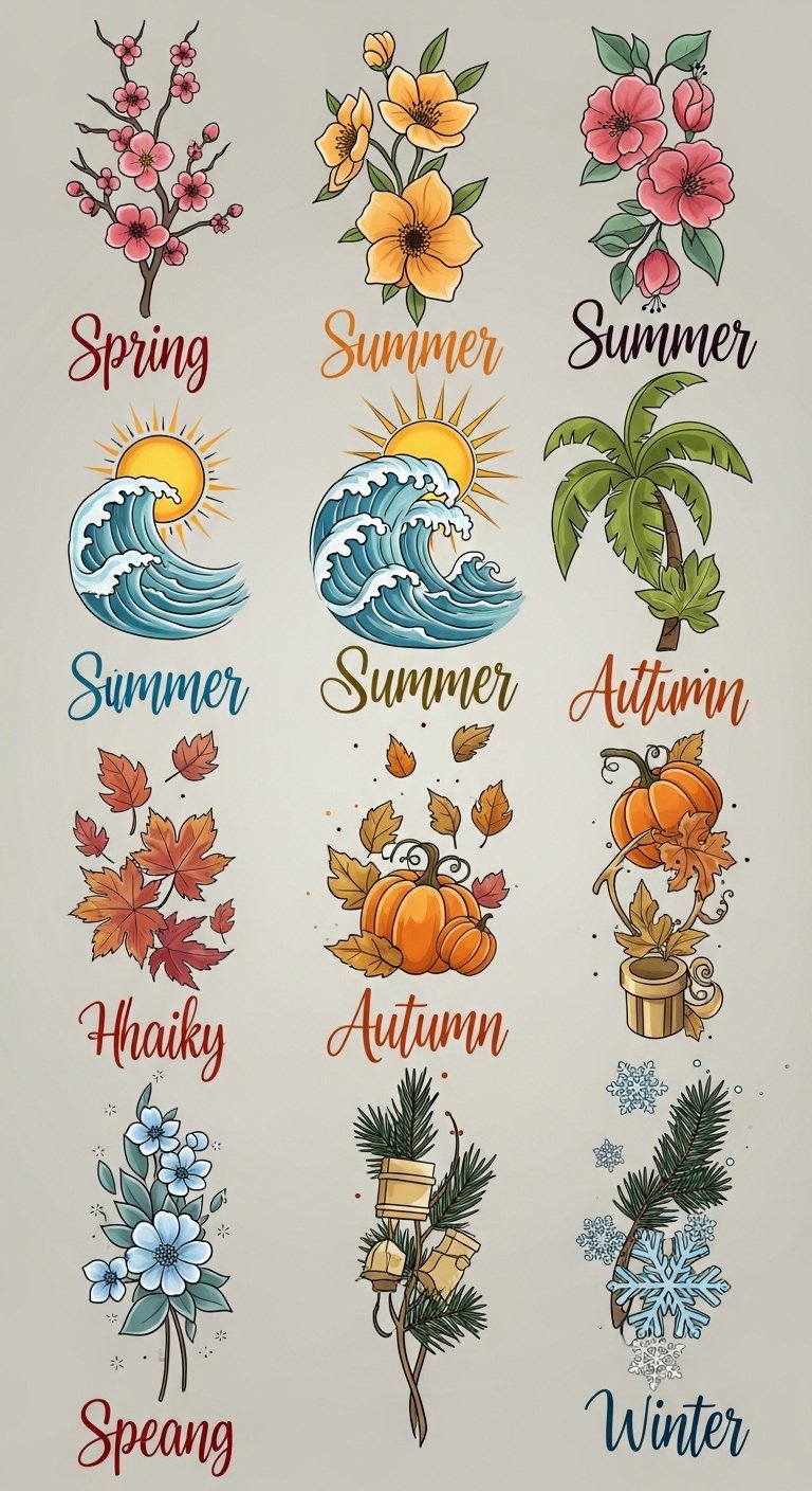 A wraparound forearm piece that transitions through four distinct seasonal panels: delicate cherry blossoms and pastel buds for spring, sun-drenched wildflowers and soft green foliage for summer, warm-toned falling leaves and small harvest motifs for autumn, and fine, crystalline snowflakes with muted blues and silvers for winter. Symbolically it represents growth, abundance, transformation, and rest—comforting emotions tied to each phase of life. Designed to flow with the arm’s natural movement, it works well along the outer forearm or calf where the continuous cycle can be displayed and easily expanded.