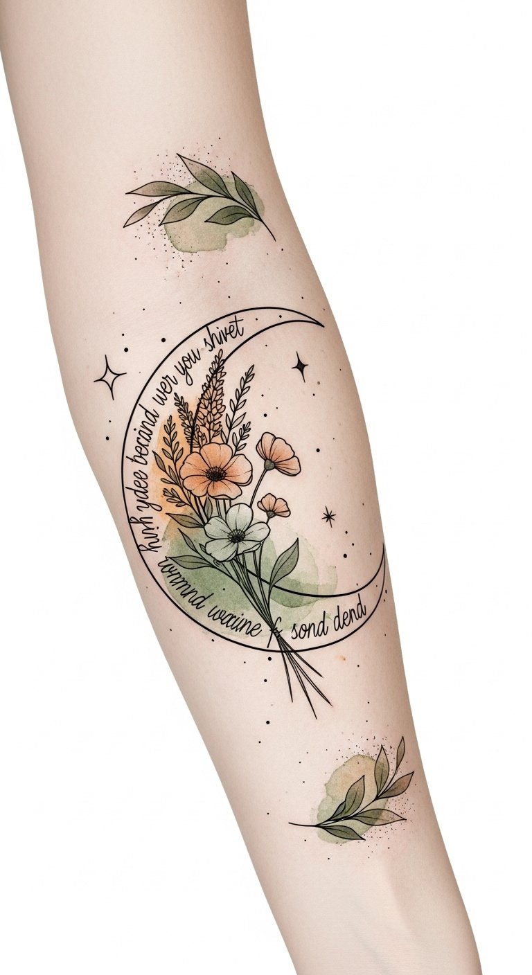This design blends celestial and botanical elements to symbolize growth, renewal, and inner resilience. The crescent moon represents cyclical change and intuition, while wildflowers signify personal blossoming and variety within one’s journey. Watercolor washes add emotional warmth and softness, and the fine-line script woven into the moon creates a private, steady reminder meant to be read by the wearer. Ideal placements are the inner forearm or ribcage for intimacy and visibility; the size allows for discreet visibility while offering room for detail, encouraging daily affirmation and creative expression.