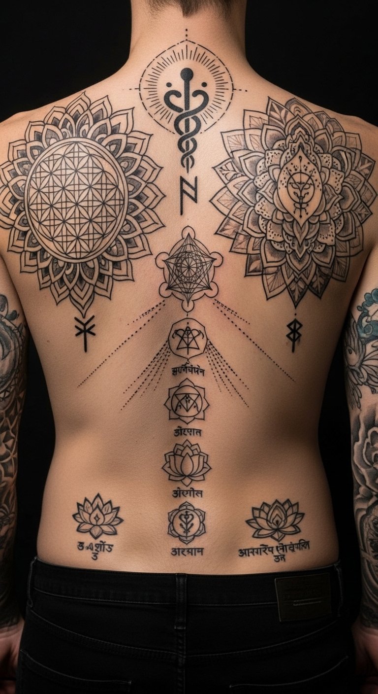 This design layers sacred geometry—an interlocking Flower of Life and subtle Metatron’s Cube—over a central mandala framed by faint chakra sigils ascending the spine, with small ancient runes woven into the mandala’s outer rings as personal totems; rendered in fine black linework with soft watercolor washes in chakra hues.