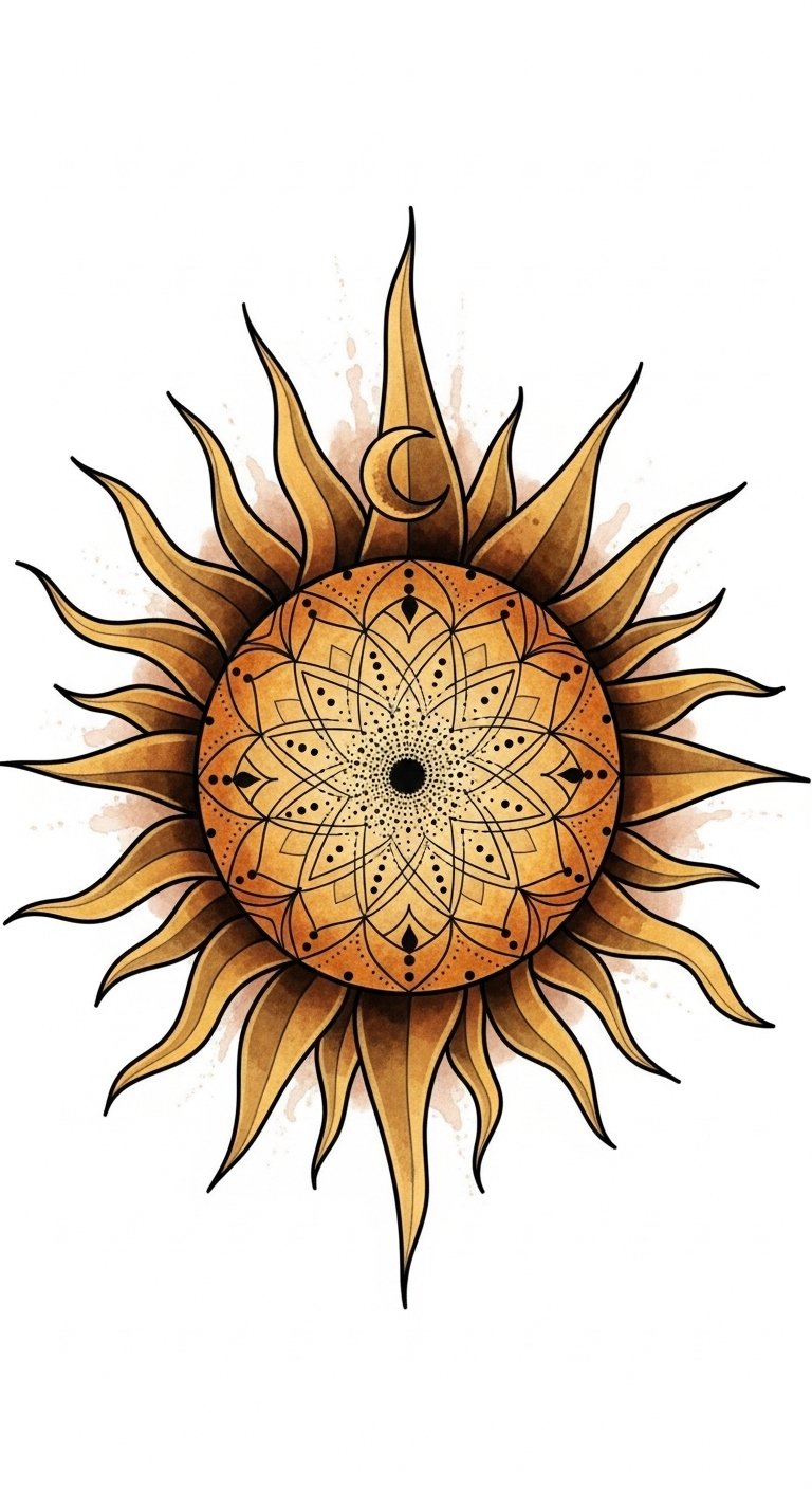 Each sun tattoo serves as a reminder of your inner strength and the freedom to shine brightly in your own unique way. This design blends radiant warmth with contemplative geometry to evoke empowerment and serenity; the watercolor tones soften bold energy into approachable vitality, while the mandala center and crescent accent hint at balance and cycles.