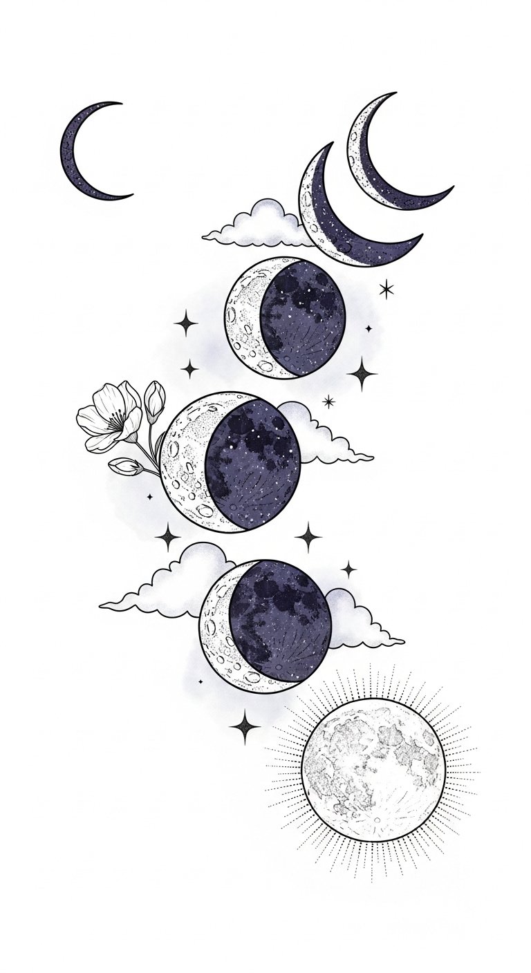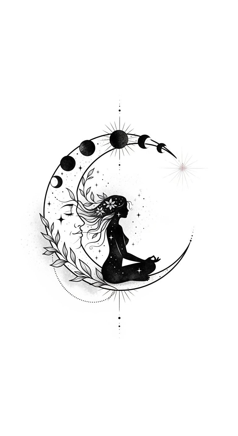 As you connect with the moon’s essence, you’ll find liberation in its gentle reminders of change, nurturing your spirit and strengthening your bond. This tattoo concept channels that text into imagery: the crescent and phase markings echo the cycles and change; the meditative figure and flowing botanical hair represent feminine intuition and nurturing growth; dotwork and soft shading evoke the moon’s gentle glow and emotional calm.