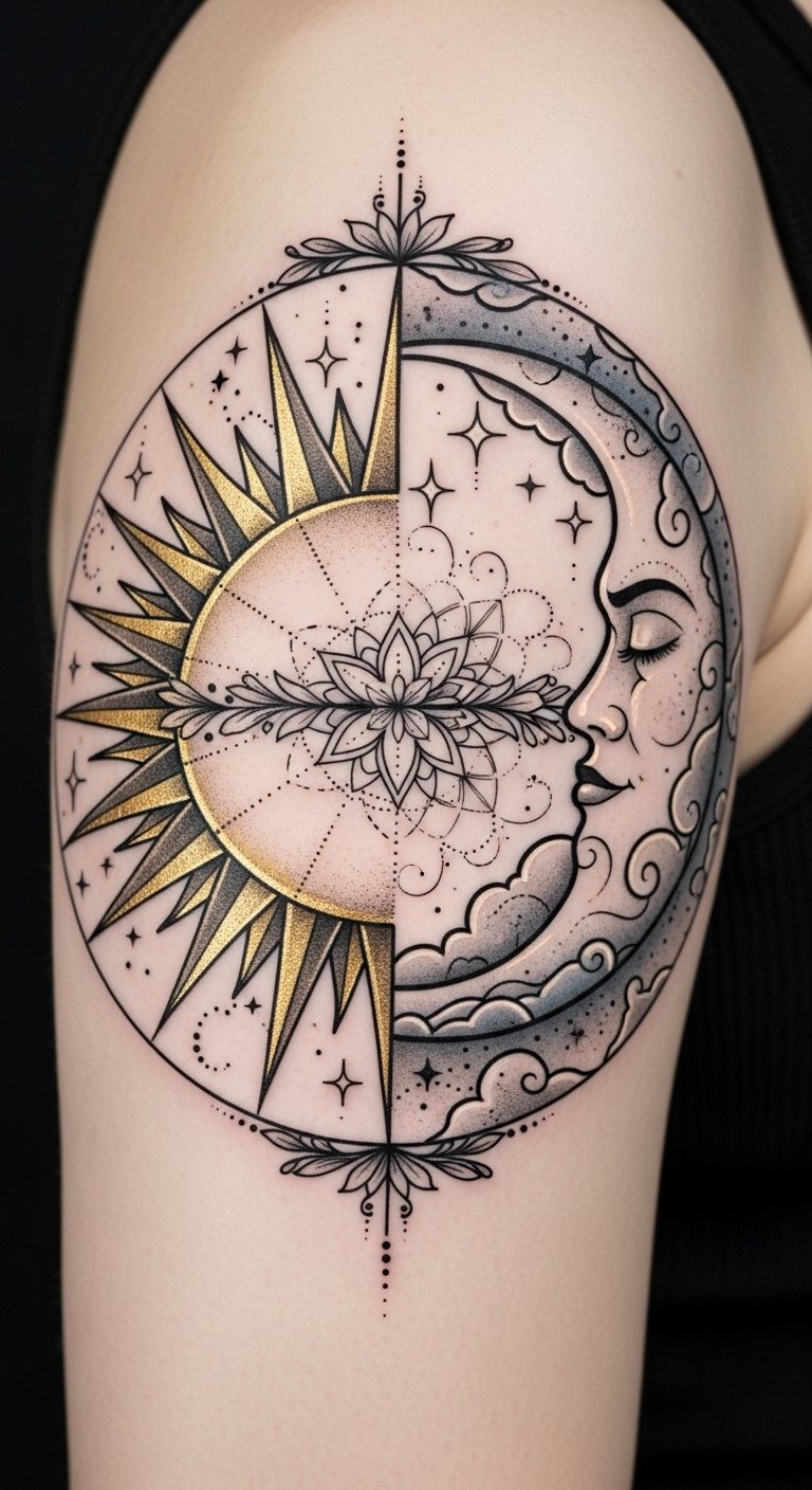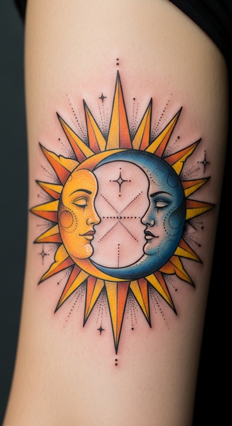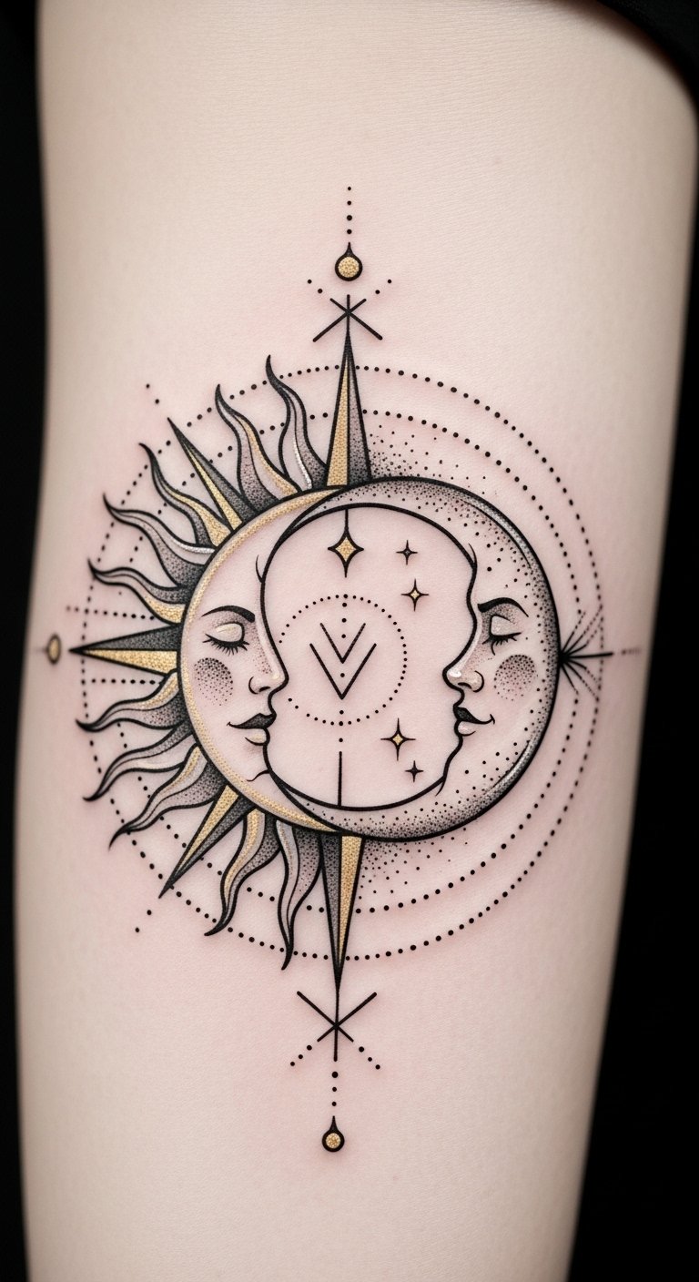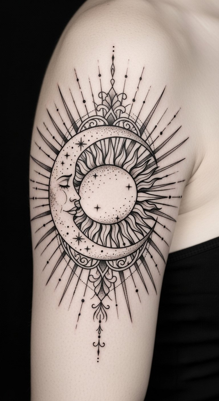 This design emphasizes unity and contrast: the sun’s open rays convey vitality and outward confidence, while the moon’s crescent and dotwork suggest inward reflection and intuition.