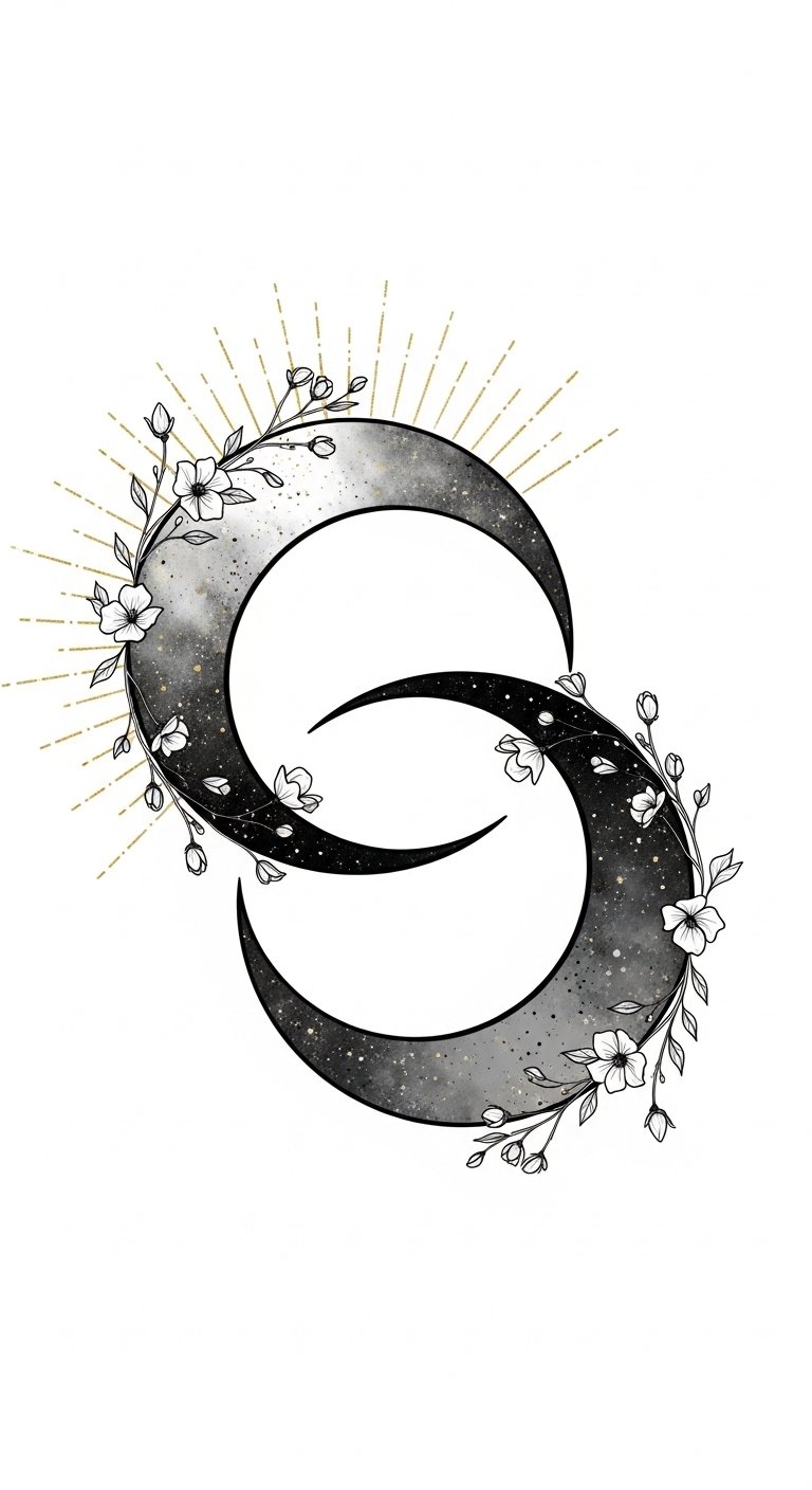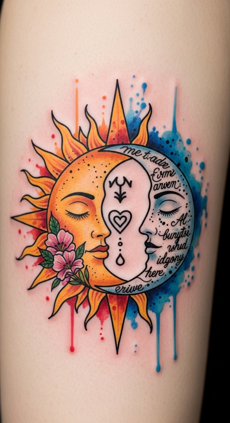 How the sun and moon are combined, the chosen style, and the added symbols turn this concept into a deeply personal emblem: the sun rendered in warm watercolor hues paired with a crescent moon in cool, soft gradients to show complementary energies; a shared favorite flower woven between them to signify common roots; and a short meaningful quote tucked along the curve as a discreet reminder of your story.