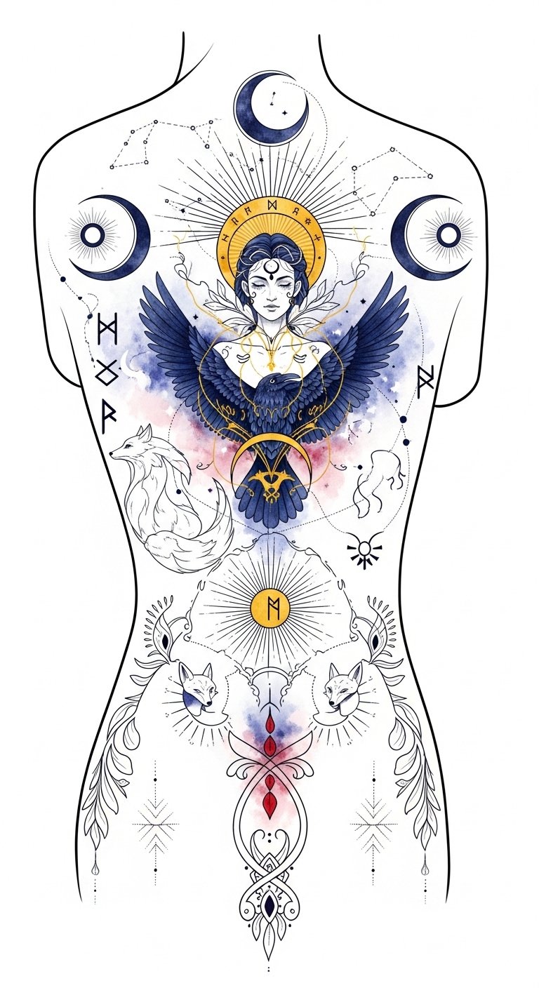 The design evokes reverence and introspection—haloed deity for guidance, animals for cunning and transformation, and celestial elements for fate and cycles—intended to feel like an intimate talisman; place along a forearm or rib for personal visibility, or expand across the upper back as a statement piece that moves with the body, emphasizing flow and emotional resonance.