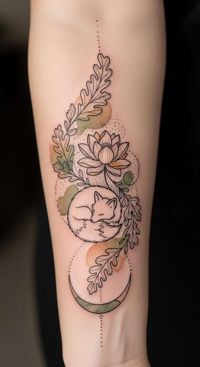 This tattoo integration allows you to celebrate freedom and your bond with nature, making each piece a personal reflection of your journey. The oak leaves symbolize strength and endurance, the lotus represents growth and rebirth, and the fox suggests cleverness and adaptability; together the elements evoke resilience and serene confidence.