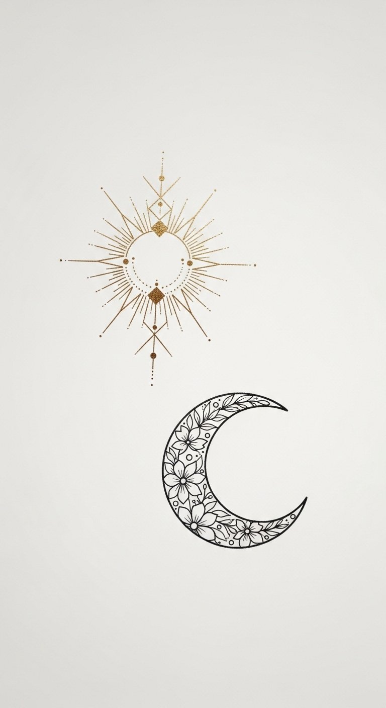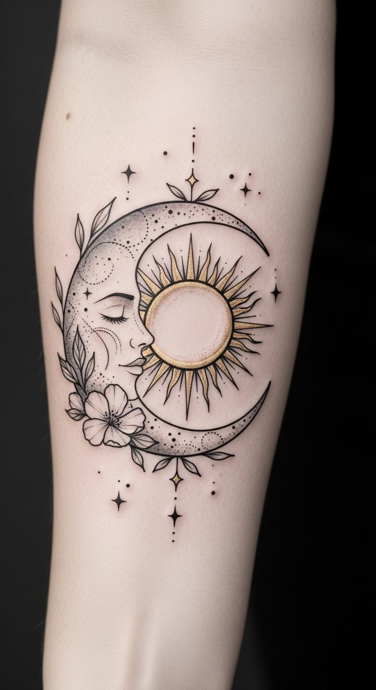 The design evokes both warmth and serenity—sun rays for vitality and outward expression, the crescent for introspection and gentle protection; placement on the forearm or shoulder blade allows the piece to flow with natural movement, making it visible in moments of confidence or tucked close as a private talisman.