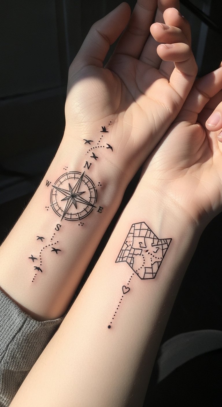 When you and your partner decide to get matching tattoos, it’s not just an artistic choice; it’s a powerful expression of your bond. These designs reflect your shared journey, showcasing couples’ creativity. Seek tattoo inspiration that resonates with both of you, whether it’s symbols of love, adventure, or personal growth. Each inked piece tells your unique story, celebrating your connection and freedom together. The compass and map fragments symbolize guidance, shared direction, and the journeys you’ve taken together; the birds and heart signify freedom, love, and milestones reached. Emotionally intimate and subtly visible, these matching wrists or inner-forearm placements allow daily reminders of commitment without overpowering, and the minimalist execution keeps the focus on meaning rather than ornamentation.