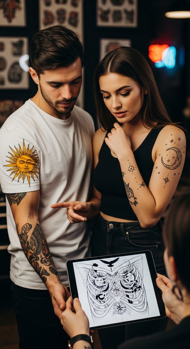 This concept centers on complementary sun and moon motifs placed to reflect visibility and intimacy: a bold, geometric sun on one person’s forearm for outward expression and a softer, crescent moon with delicate linework on the other’s ribs for private meaning.
