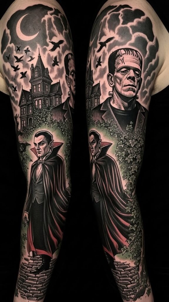 Placement along the outer forearm or wrapping around the upper arm allows the composition to read like a poster, the mansion and moon anchoring the top while the monsters face each other in the midsection; the muted colors and distressed texture suggest nostalgia and reverence, evoking a melancholic thrill and pride in classic horror fandom.