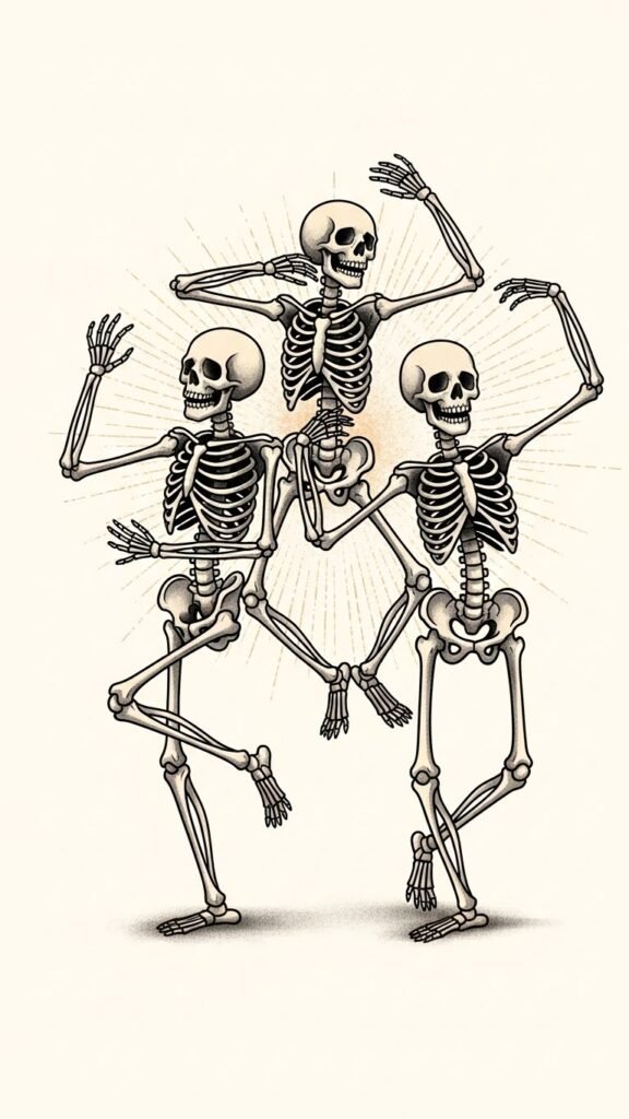 This design uses the original evocative lines to inform a tattoo that balances macabre imagery with lighthearted motion: interlocking skeleton figures in mid-twirl with flowing ribbons, confetti-like dots, and subtle shadowing to suggest depth and movement. Symbolically it celebrates the coexistence of mortality and joy, turning deathly forms into symbols of resilience and freedom; emotionally it aims to provoke smiles, mischief, and a reminder to find levity in hardship. Ideal placements include a forearm sleeve that allows the choreography to wrap and animate with arm movement, the ribcage for a larger airy composition, or the calf for a vertically flowing dance.