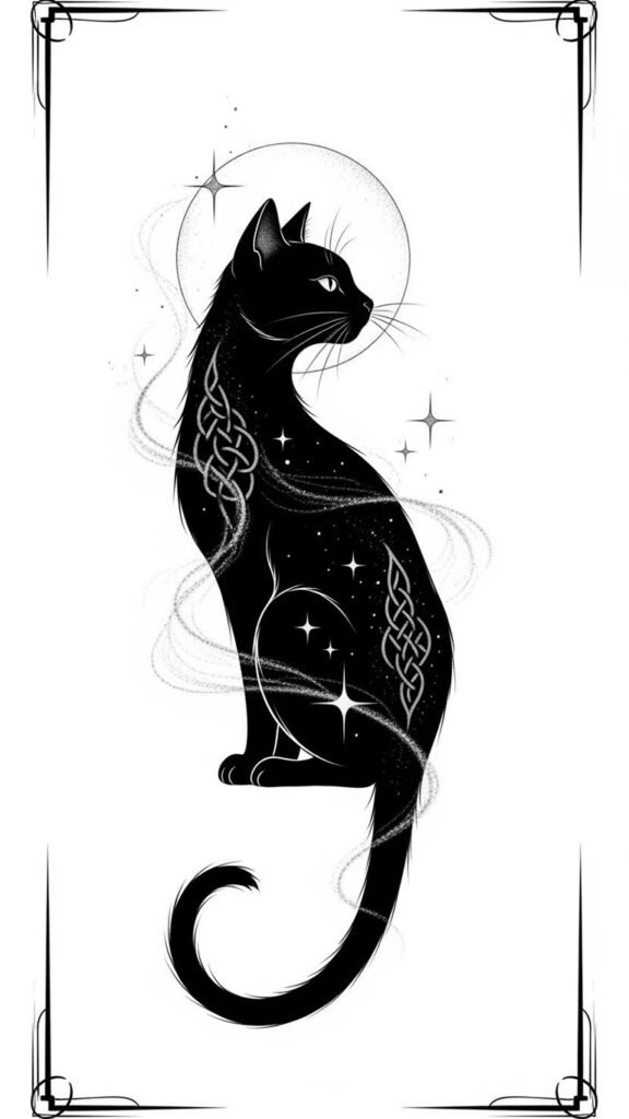 A tattoo of a sleek black cat can evoke an air of mystery, inviting whispers of magic and charm. Let your skin tell a story of enchantment and allure this Halloween. Placed on the inner wrist or along the forearm, the design emphasizes intimacy and movement; the silver highlights catch light to create subtle depth, while the Celtic knots and mist suggest ancestral protection and the fleeting, playful nature of intuition.