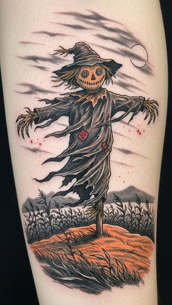 Ink this eerie farm guardian onto your skin, letting its mysterious allure awaken your adventurous spirit this Halloween.