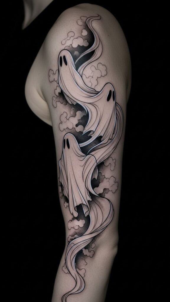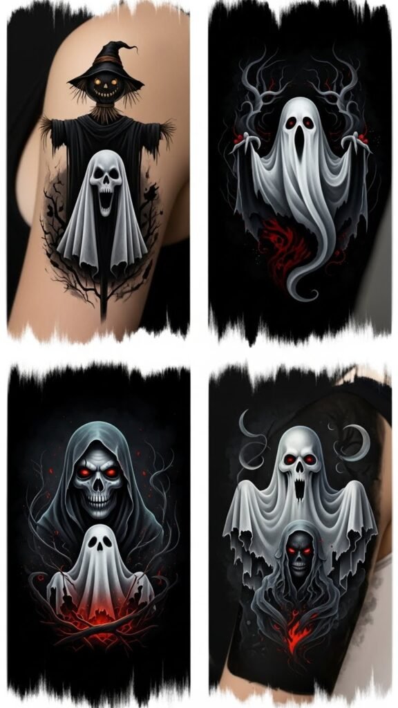 From the eerie silhouette of a scarecrow, we move to the ethereal domain of lifelike ghosts, where apparitions dance between the worlds of the living and the dead. Picture haunting portraits adorned with spectral imagery, capturing chilling expressions and translucent figures. These ghostly apparitions, draped in eerie colors and whispered legends, invite supernatural elements and phantom silhouettes to haunt your skin with their enchanting beauty. The design symbolizes the boundary between life and death, memory and forgetting—ghosts rendered with soft, translucent shading and deliberate gaps to suggest fading; whispered legends can be inked as faint script or torn ribbon banners weaving through the figures. Emotionally it evokes melancholic beauty and quiet unease; ideal placements include the forearm or ribcage for a vertical composition, or across the upper back for a cinematic spread, allowing the ghostly portraits room to breathe and the color washes to blend naturally with skin tone.