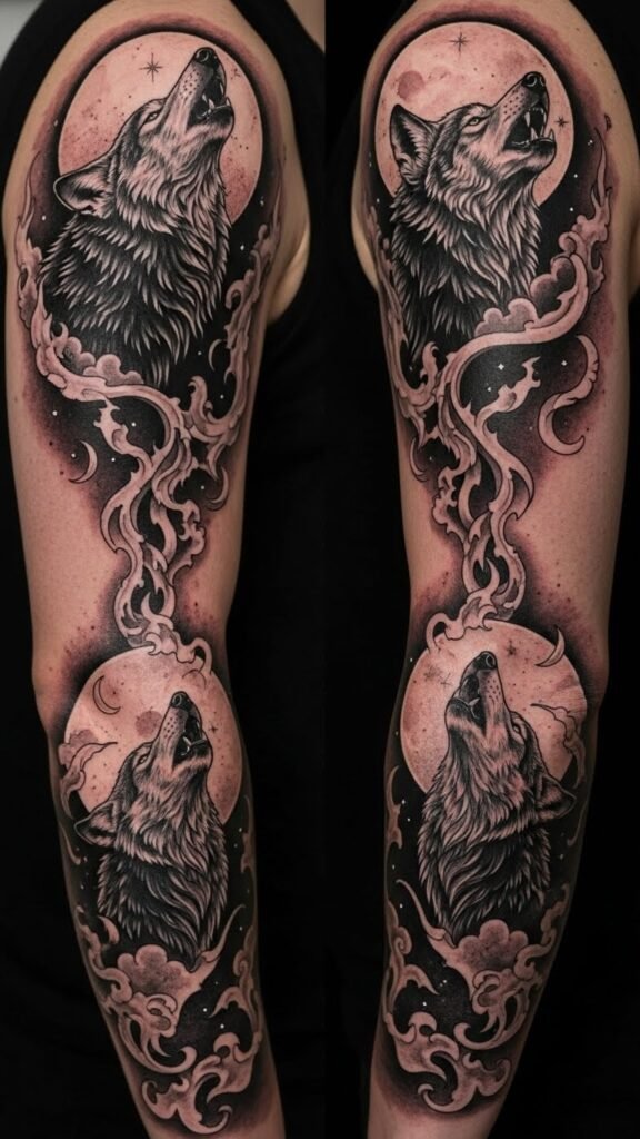 A forearm or shoulder piece that places a central howling wolf framed by a luminous full moon, with swirling lunar patterns and subtle geometric lines radiating outward; dark ink and soft grayscale shading convey the raw power and mystery, while small white highlights suggest moonlight on fur and eyes, evoking freedom, transformation, and a deep, nocturnal longing—ideal for placement where movement accentuates the composition and invites personal resonance with the primal, mythic themes.