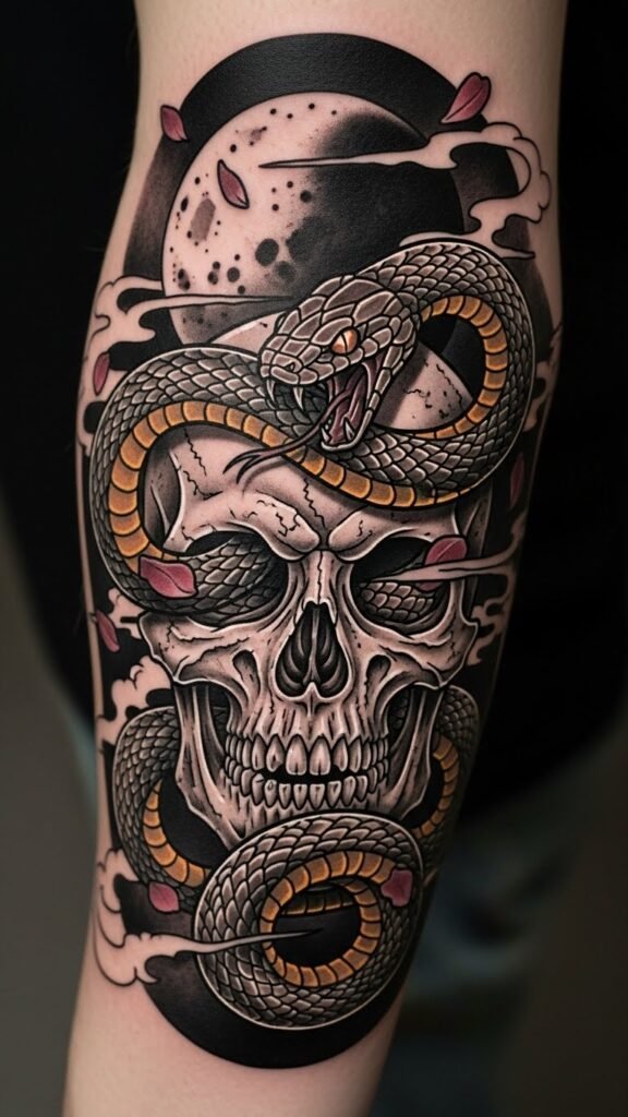These tattoos blend the haunting allure of sinister symbolism with enchanting snake motifs, coiling around skulls in a dance of life and death. Embrace this striking fusion, letting your skin tell tales of mystery and freedom beneath the moonlit sky.