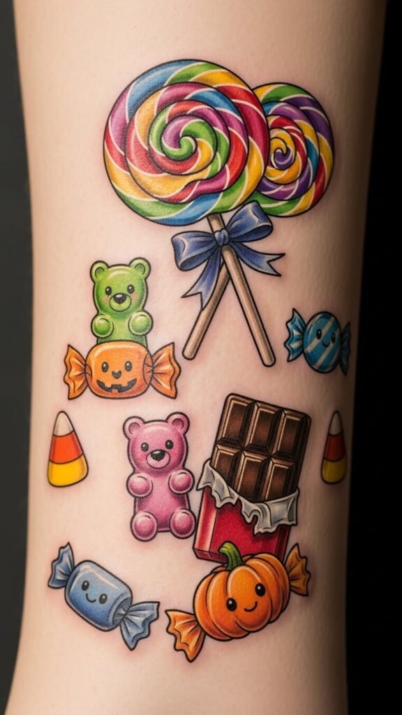 This concept uses sugary imagery to evoke nostalgia, joy, and playful indulgence; bright, saturated colors and soft shading create a tactile, almost edible quality that invites touch and smile. Placement works well on forearms, calves, shoulders, or along the ribcage to allow small clusters or a cascading trail of candies; each element can represent a memory or seasonal moment, blending childhood delight with adult whimsy and a hint of autumnal warmth.