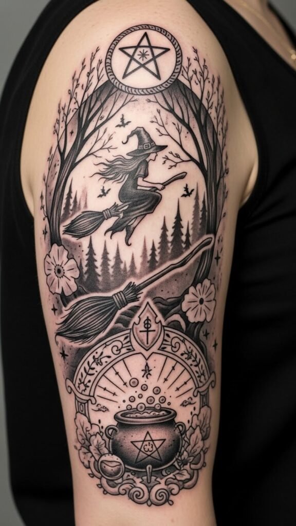 Imagine intricate broomstick designs soaring through enchanted forests, surrounded by witchy symbols and spellbinding motifs. Pair them with cauldron art and magical potions, or add witch hat tattoos and familiar spirits for a truly mesmerizing touch.