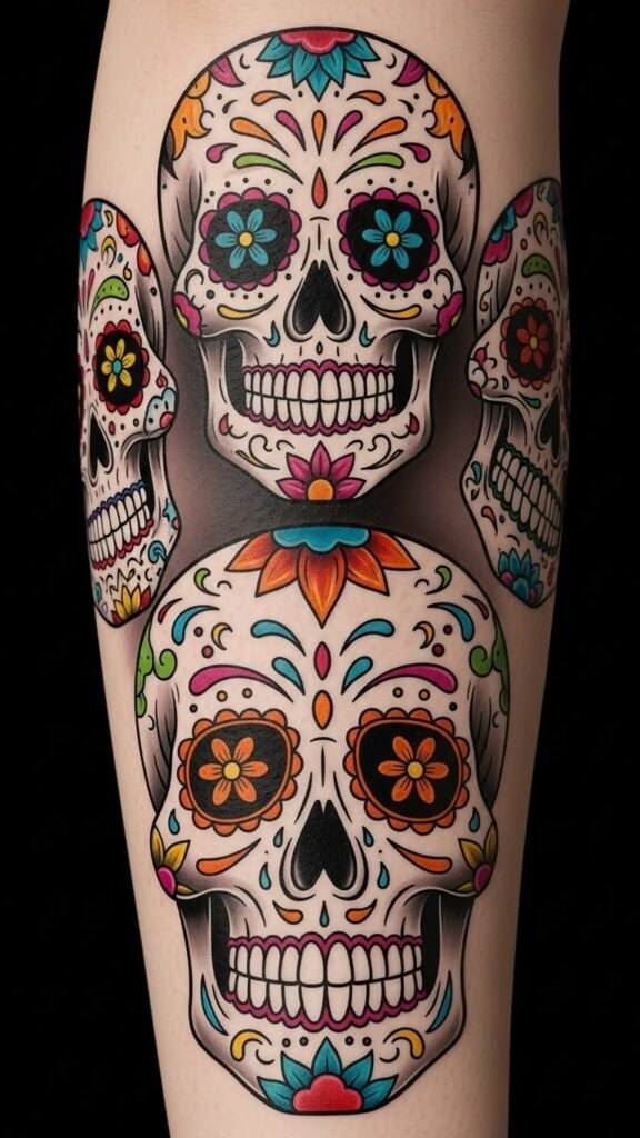 This design concept centers on a richly decorated sugar skull framed by marigolds and papel picado, using vibrant blues, oranges, and fuchsia with filigree, heart, and cross motifs woven into the cranial contours; subtle ghostly figures drift outward, transitioning from translucent grayscale into saturated color to show movement between worlds.