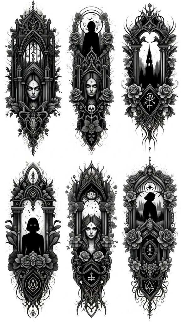 This design marries architectural arches and ribbed vaults with curling black roses and delicate thornwork, creating a sleeve or backpiece that feels like stepping into a ruined chapel at dusk.