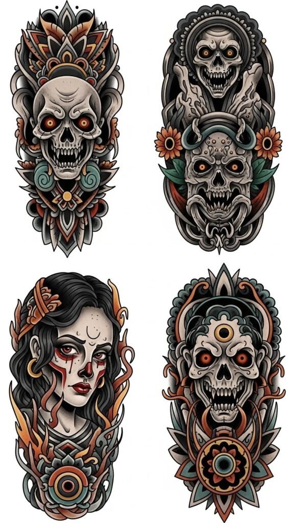 Immerse yourself in the enchanting domain of neo-traditional horror elements, where vivid colors and bold outlines breathe life into chilling imagery.