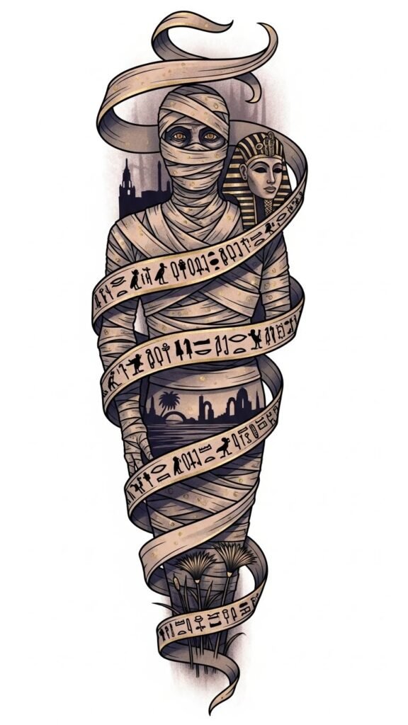 What stories do the ancient wrappings of a mummy hold? Imagine ink flowing like the Nile, tracing the secrets of ancient Egyptian lore across your skin.