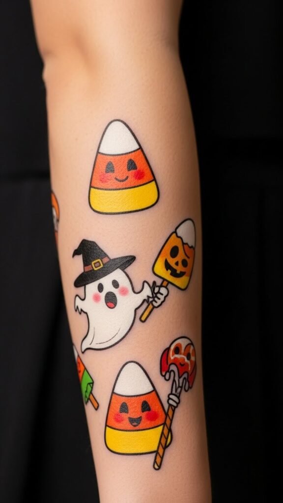 This tattoo concept layers small candy corn motifs with tiny silhouettes of ghosts, goblins, and witches in a playful, flowing composition meant for a forearm, calf, or along the ribcage. Symbolically it celebrates nostalgic innocence and carefree adventure—the candy corn as sweet anchors of memory, the little figures representing imagination and community play. Use warm autumn tones with soft gradients and subtle white highlights to evoke evening glow; spacing allows the design to feel like a procession, evoking motion and joyous freedom when placed where it can be seen in movement.
