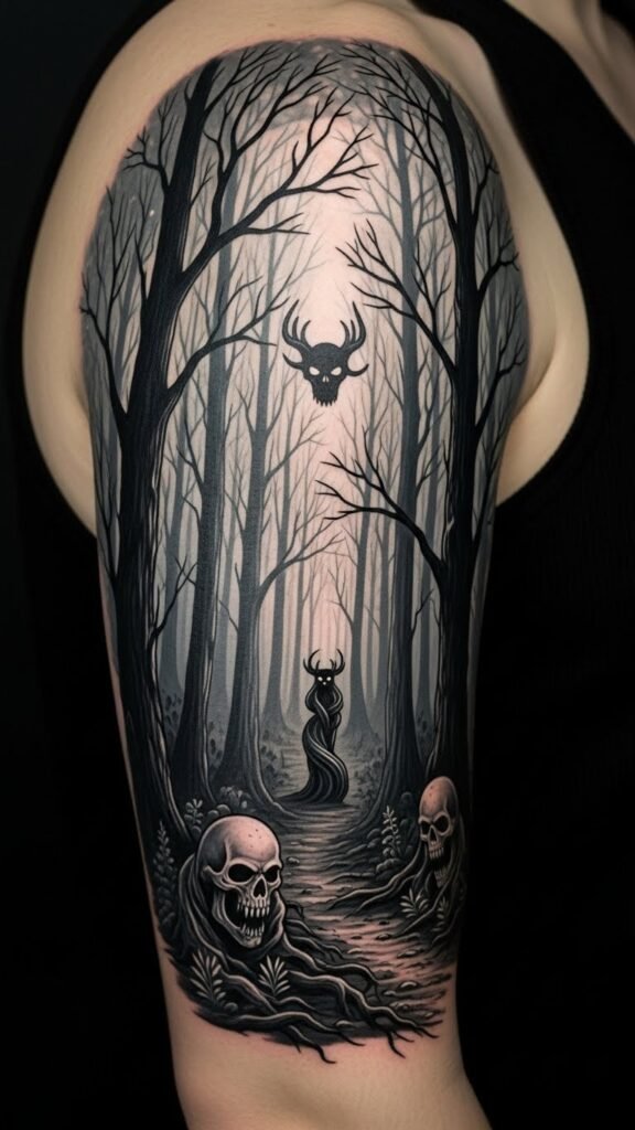 A sleeve or back-piece design that uses high-contrast blackwork and subtle gray wash to emphasize the twisting trees, drifting mist, and silhouetted figures; symbolism centers on the tension between curiosity and caution—trees represent resilience and secrets, shadows signify the unknown, and the wind’s whispers suggest memory and guidance; emotionally the piece evokes a blend of serene eeriness and contemplative mystery; ideal placement is along the forearm for a narrative wrap, full sleeve for immersive storytelling, or centered on the upper back where the composition can breathe and flow with the body’s contours..