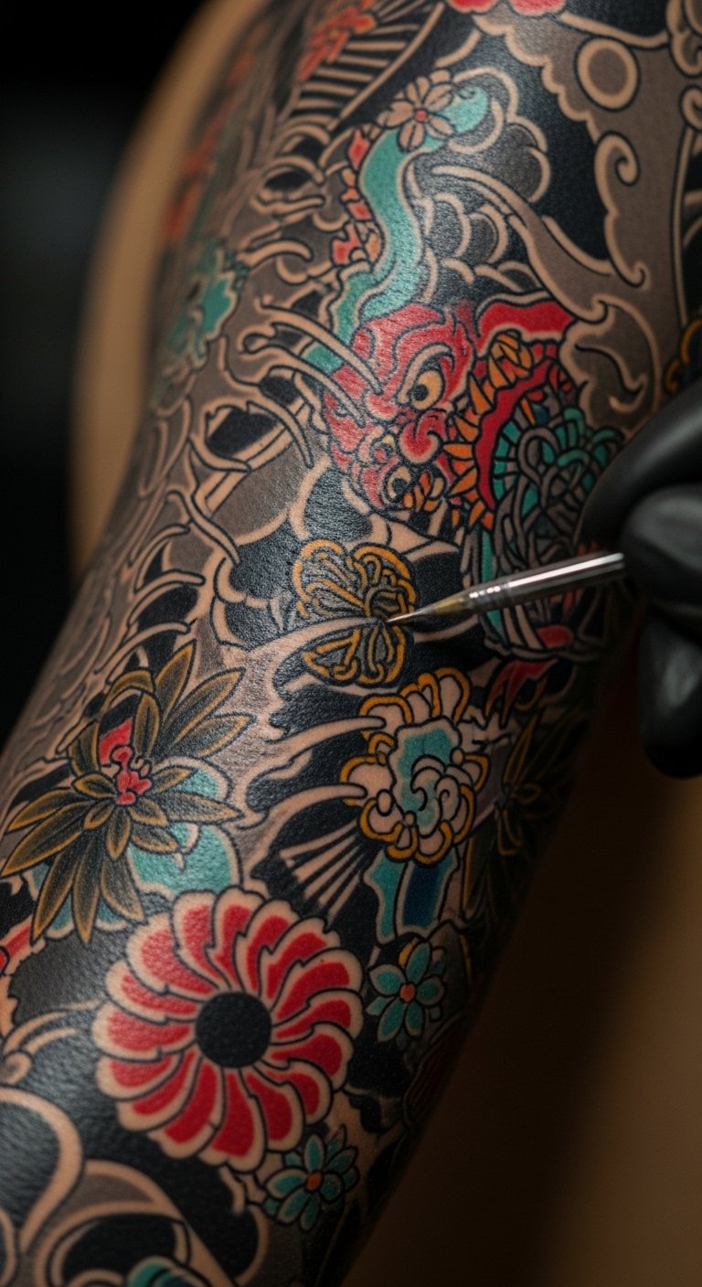 This design concept centers on a full bodysuit that evolves over time through layered touch-ups: delicate linework anchors the composition while successive color passes add depth, highlights, and subtle texture where needed, allowing motifs to gain clarity and vibrancy.