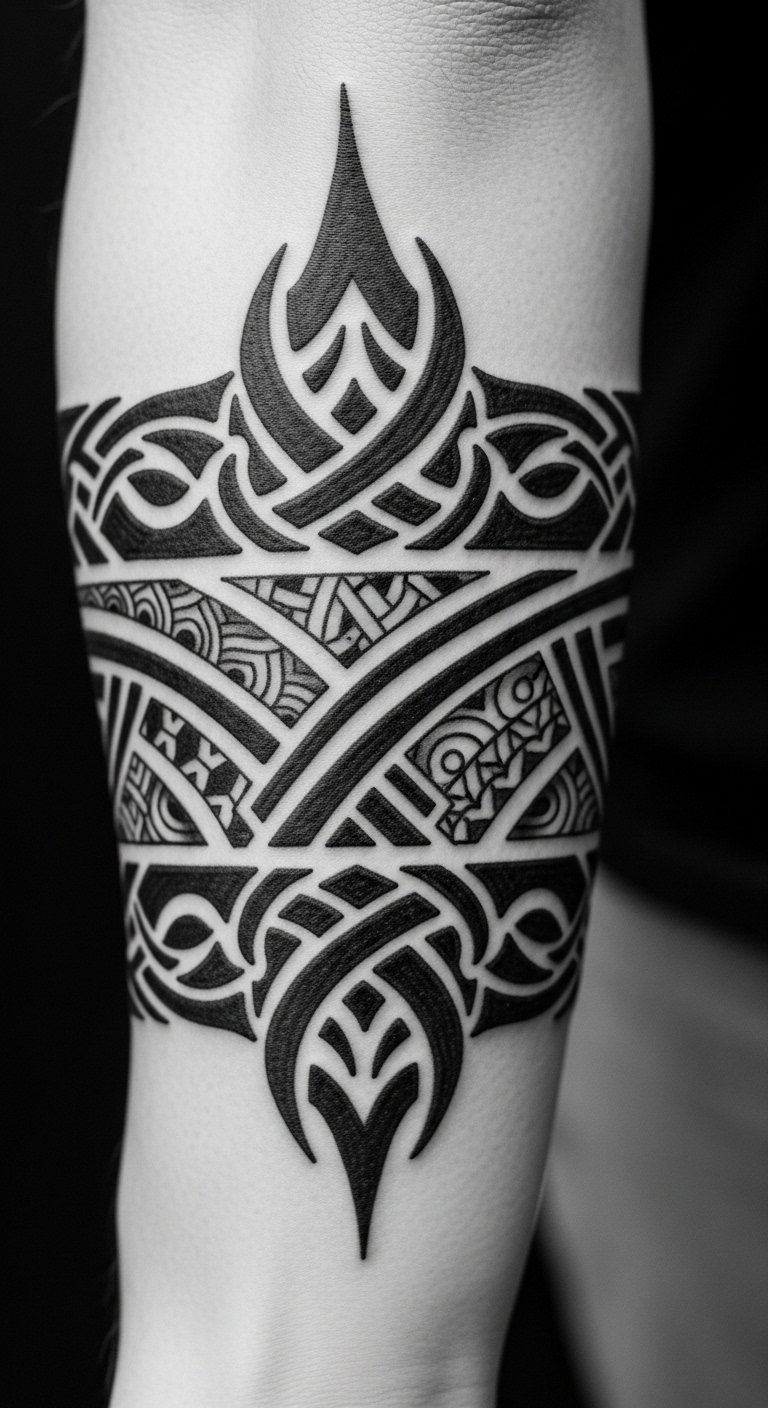 The concept channels symbolism of lineage and protection through repeating motifs and interlocking elements, evoking pride and grounding; ideal placement is a forearm band to allow visibility and personal connection while flowing naturally with muscle contours.