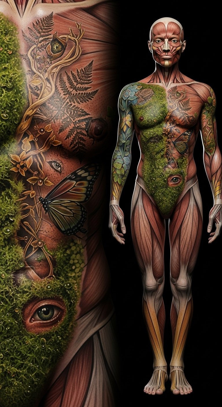 Emotionally, the piece evokes calm, renewal, and a quiet power, intended to be experienced both up-close and at a distance. Ideal placement is a full bodysuit flowing with muscles and joints—torso, back, arms, and legs—so the organic elements follow movement and create a living, breathing visual narrative.