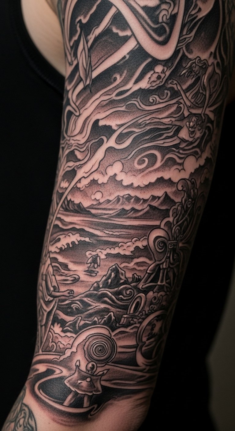 A sleeve design that translates the dreamlike narratives into layered imagery: a horizon of melting clocks and floating islands that transitions into swirling forests inhabited by translucent, ethereal beings; fine-line dotwork and soft watercolor washes to emphasize the blurred boundary between reality and fantasy. Symbolically, melting clocks suggest fluid time and memory, floating islands represent personal escape and autonomy, and ethereal beings embody subconscious desires — together they evoke liberation, introspection, and creative rebirth. Ideal placement: full arm sleeve to allow narrative flow, or extended across the torso and ribcage for a larger continuous landscape.