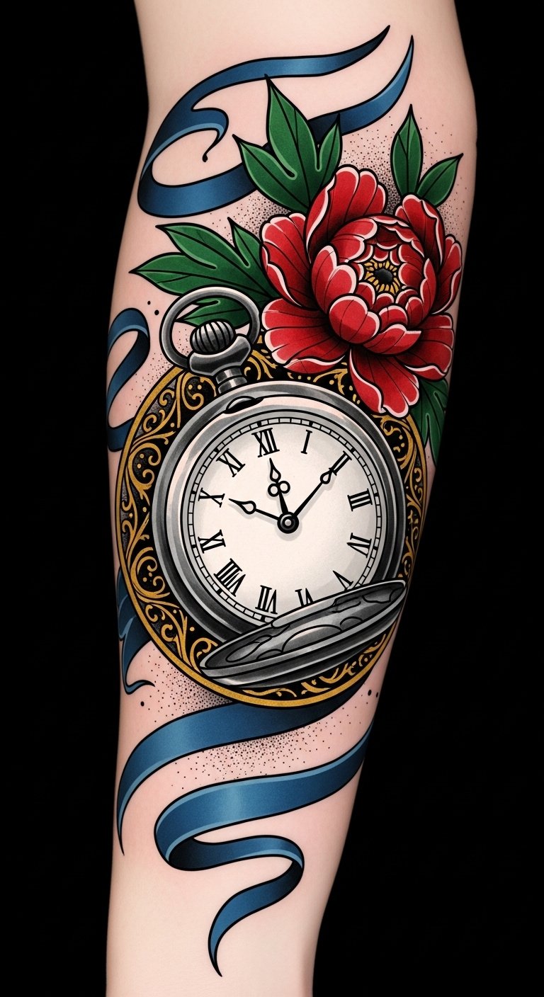 The pocket watch symbolizes time’s passage and memory, while the peony represents beauty and resilience; together with the flowing ribbons and filigree they evoke nostalgia tempered by personal growth.