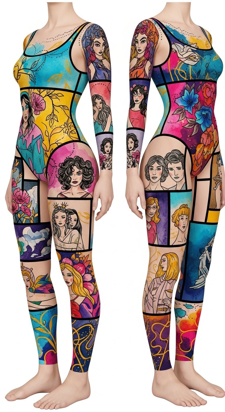 Emotionally it aims to inspire confidence and celebration of identity. Ideal placement is a full-sleeve-to-torso wrap or full-body suit layout, with focal scenes across the chest and back for storytelling clarity and continuous imagery along arms and legs to accentuate movement and the wearer’s physical form.