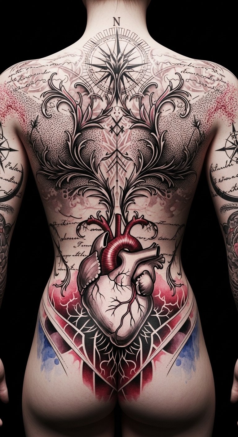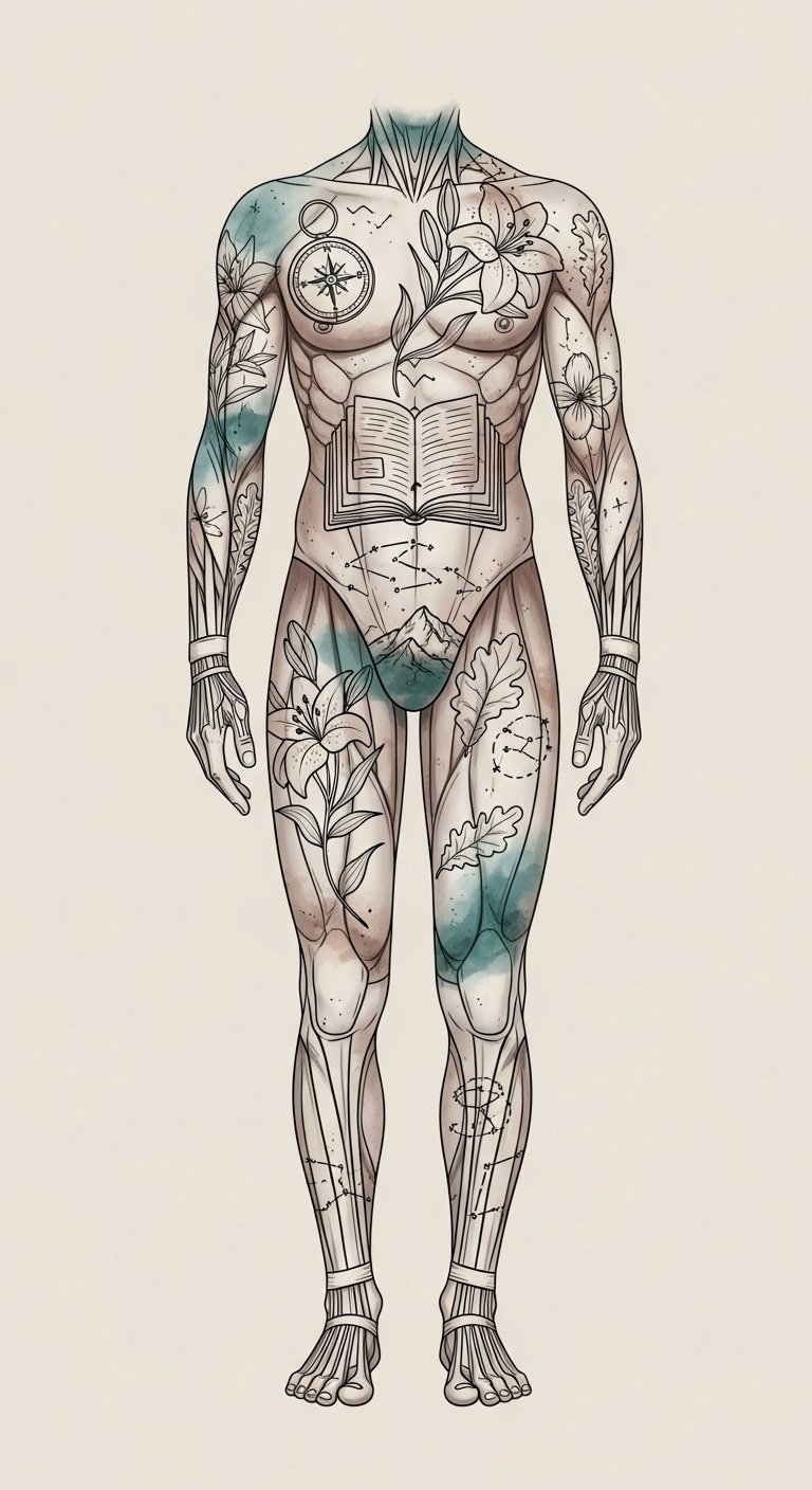 Placement follows body flow—compass near the sternum as a heart-guide, book pages along the ribs for personal narrative, flora rising on the arms as growth, mountain across the lower back for foundational endurance, and constellations scattered over shoulders and thighs to suggest reach and wonder—ensuring the design reads both close-up and at a distance.