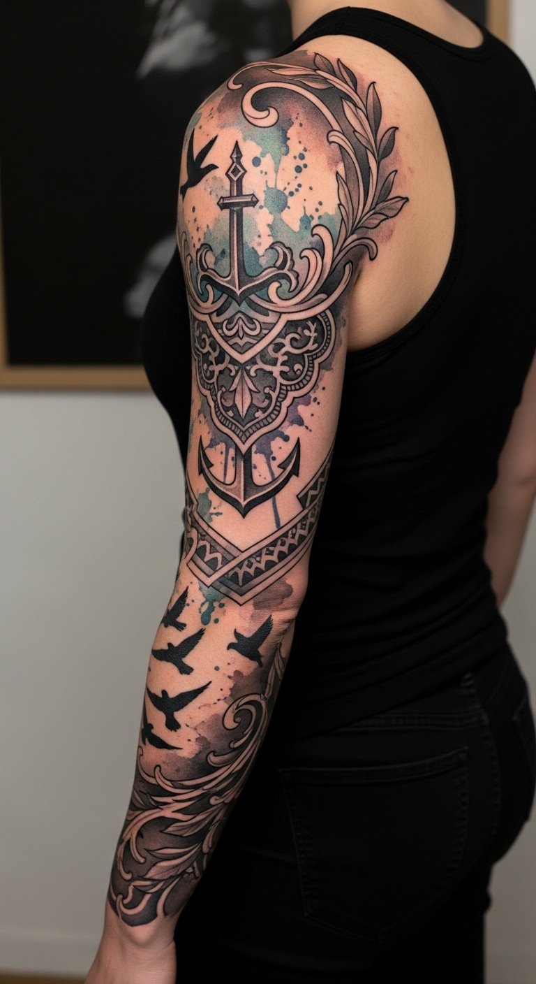 Whether bold or delicate, these tattoos enhance your narrative flow, inviting curiosity and connection with every movement you make. The design merges structured geometry as anchors for identity with organic vines that symbolize growth and resilience; watercolor accents convey fleeting emotion, while birds in negative space represent liberation and transitions.