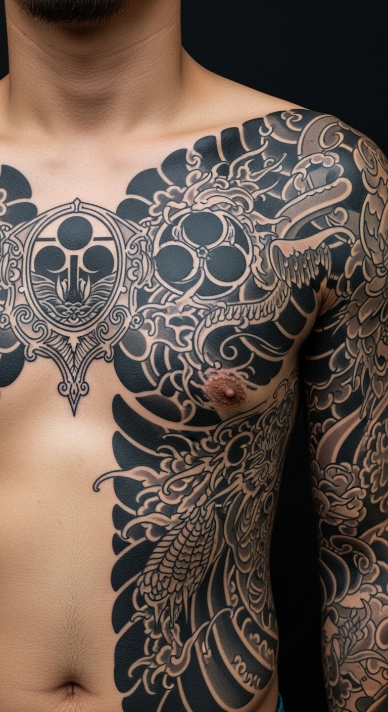 This concept pairs bold chest imagery—a central crest-like motif combining protective elements such as stylized armor plates, a guardian animal, or a sigil—with sweeping hikae extensions that flow across the shoulder and upper arm.