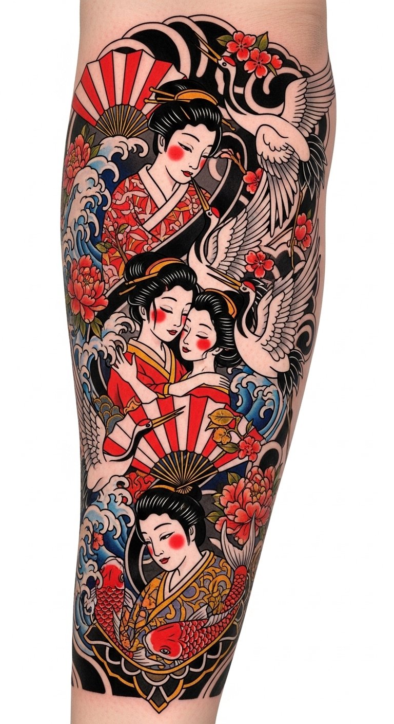 The design’s symbolism marries sensual intimacy (central embrace) with longevity and resilience (cranes, koi), while flowers add fleeting beauty; emotionally it balances warmth, mischievousness, and reverence.