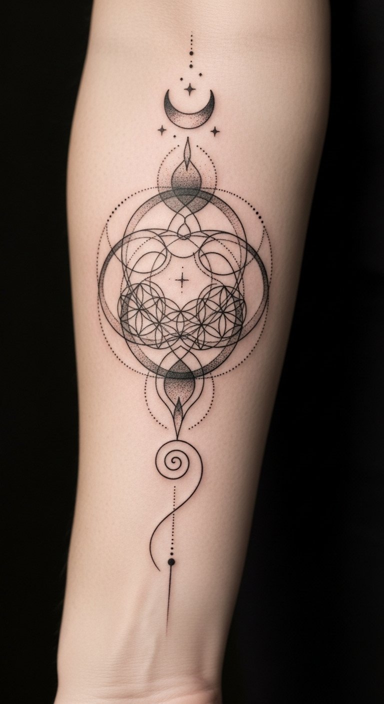 This design uses the mandala and flower of life to symbolize unity and interconnectedness, the crescent and stars to suggest guidance and cycles, and the spiral to represent personal evolution.