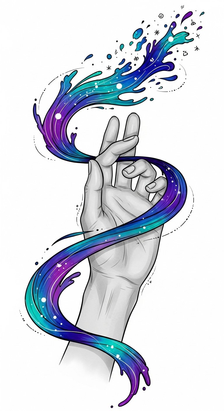 The hand holding the ribbon of ink symbolizes the collaborative act between client and artist—control and trust—while the morphing brushstrokes represent creative evolution and personal growth; vibrant colors convey vitality and emotional intensity, and the subtle splatters and negative space suggest spontaneity and moments of release.