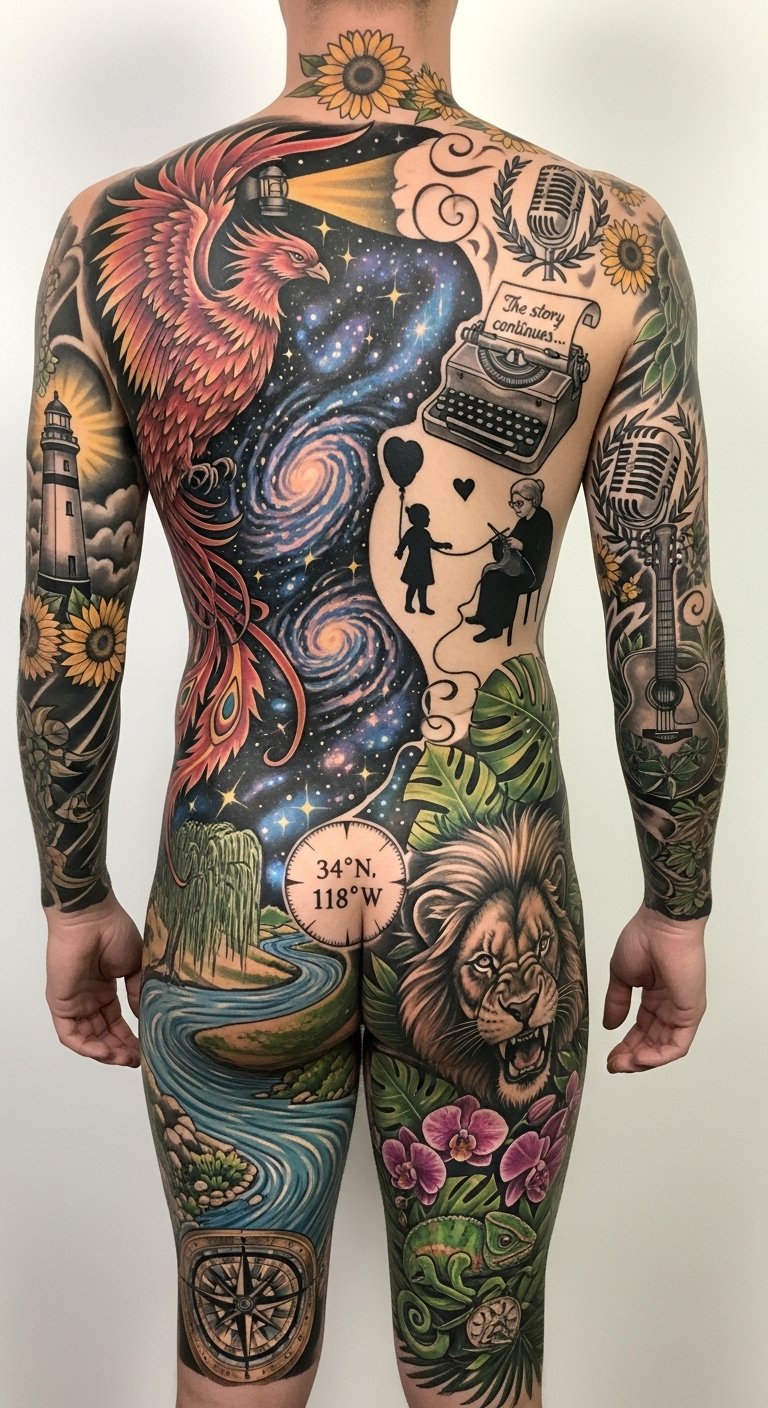 This design harnesses the original text’s themes of individuality, expression, and freedom by using intertwining vines and birds to symbolize personal growth and liberated movement; script fragments echo the owner’s personal story without overt literalization, while geometric anchors provide structure and continuity across the body suit to ensure visual cohesion.