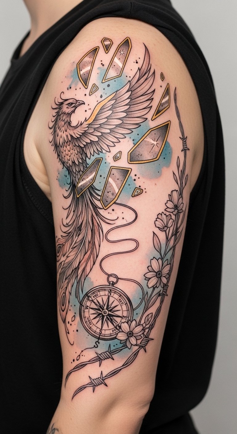 These tattoos not only reflect your past but also empower your future, allowing you to embrace freedom and redefine who you’re with every stroke. The phoenix symbolizes rebirth and resilience, mirror shards represent fragmented identity made whole, the winding thread-turned-compass denotes guidance found through self-discovery, wildflowers paired with barbed wire show beauty that persists despite pain; emotionally suited for someone moving from turmoil toward empowerment.
