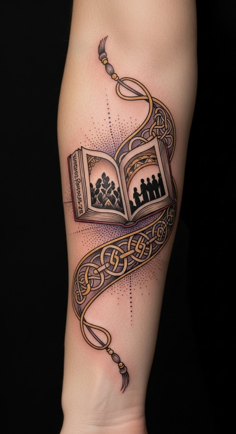 Embrace the freedom to showcase your individuality, transforming your body into a canvas of cultural pride and self-realization. This design uses the open book as origin—your personal story—whose pages unfurl into threads that form ancestral patterns and a small group of figures representing community; the earth tones ground the piece in tradition while indigo and gold highlight milestones.