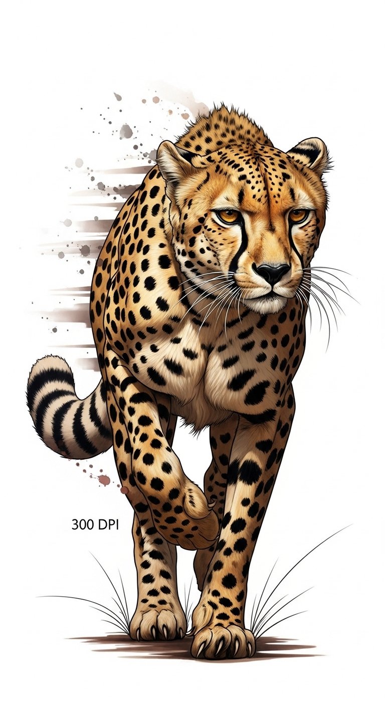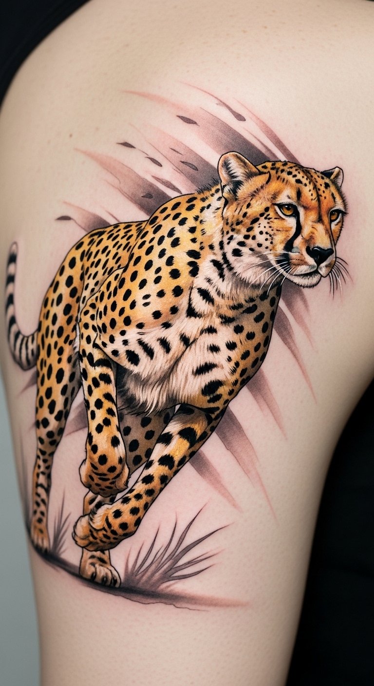 This full-body design embodies speed symbolism and fierce independence, celebrating the cheetah’s agile movements.