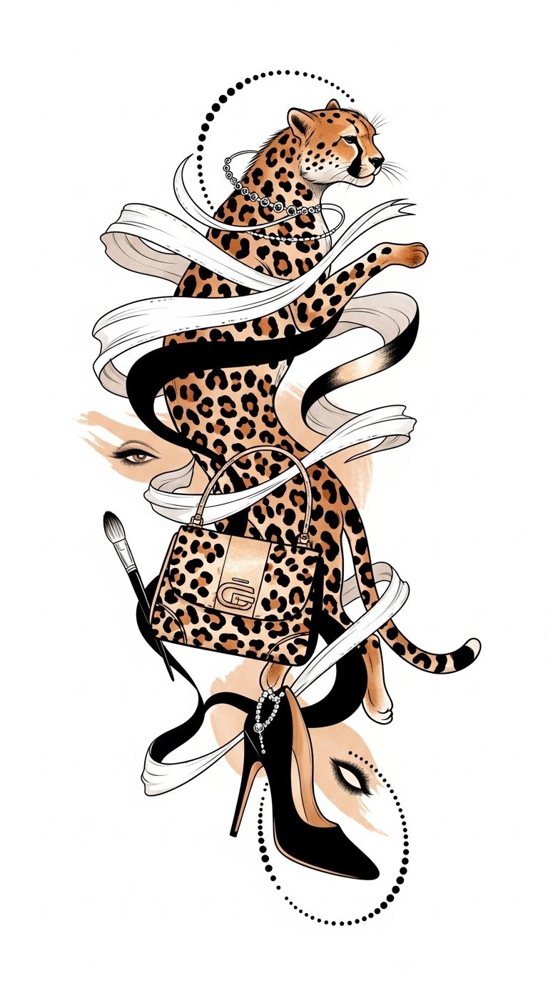 This tattoo concept weaves the original elements into a unified emblem of confidence and freedom: the leaping cheetah denotes speed and independence, the flowing ribbons suggest textiles and hairstyles, while the bag and heel motifs nod to personal style and accessories; jewelry line accents and makeup smears add femininity and artistry.